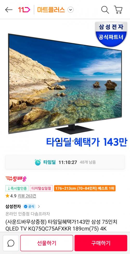 [11번가]삼성 75인치 QLED TV KQ75QC75AFXKR (1,439,000원/무료) > 국내핫딜