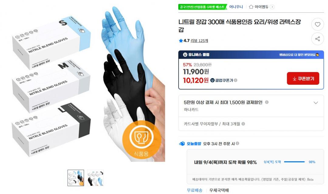 [지마켓] 니트릴 장갑 300매 식품용인증 (10,120원/무배)
