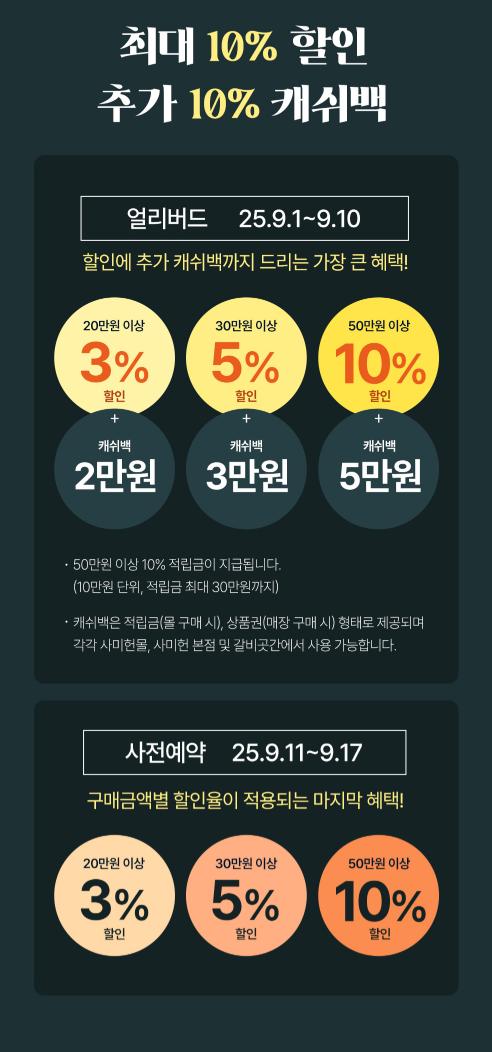 얼리버드 기간은 9/10까지라 금액별로 할인이랑 캐쉬백 적립있고