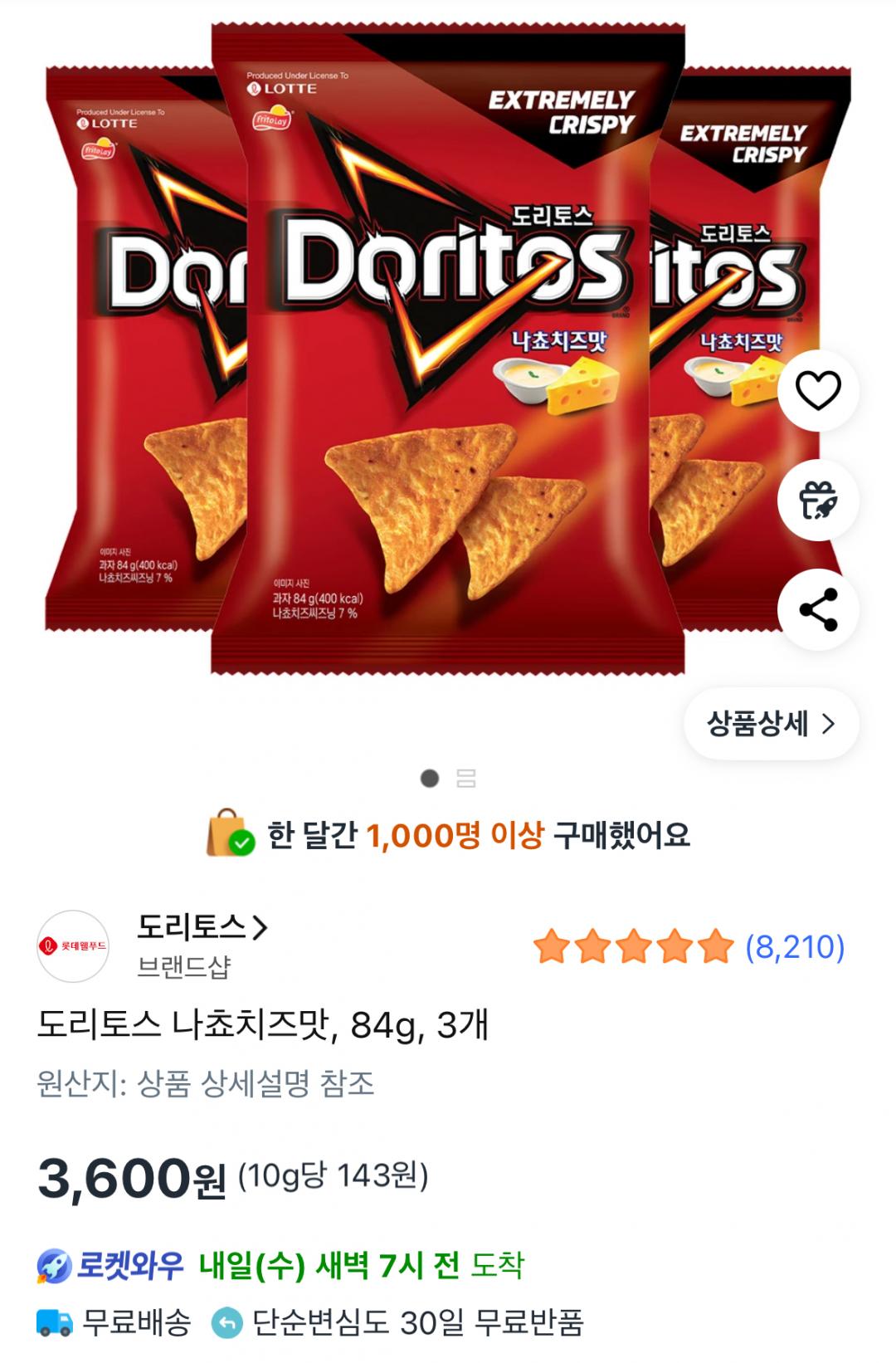 [쿠팡] 도리토스 나쵸치즈맛 84g 3개 (3,600원/무료)
