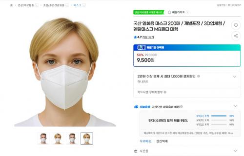 [지마켓] 국산 일회용 마스크 200매 / 개별포장 / 3D입체형 (9,500원/무배) > 국내핫딜