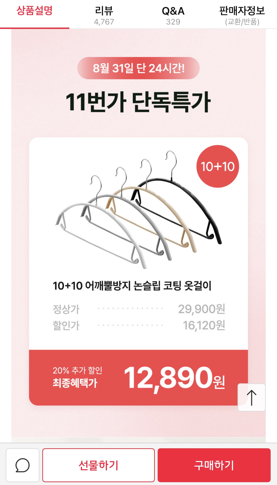 [11번가] 어깨뿔방지 베이직 논슬립 옷걸이 모음 20P (12,890원/무료)