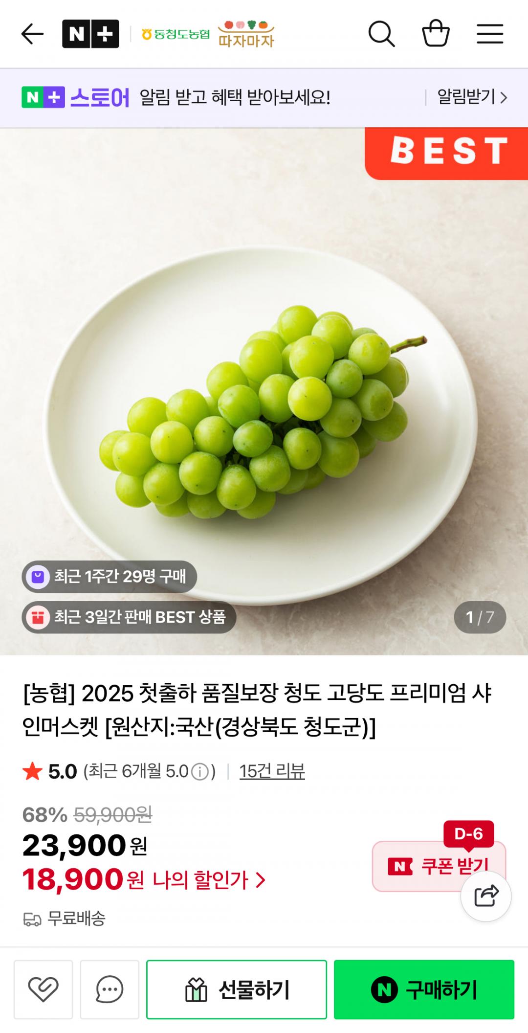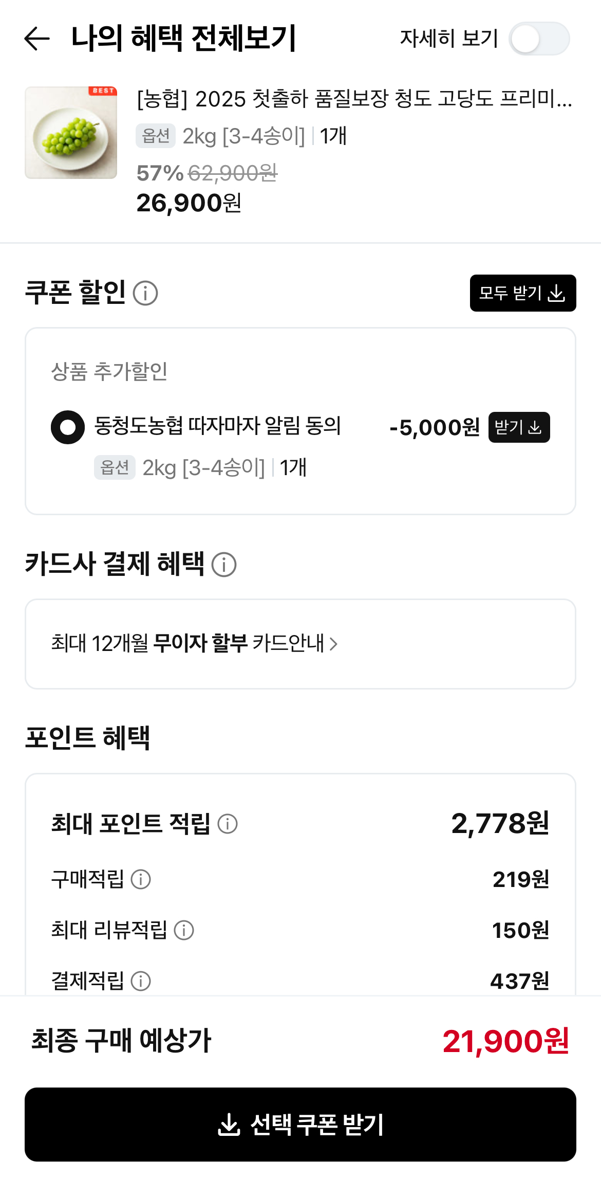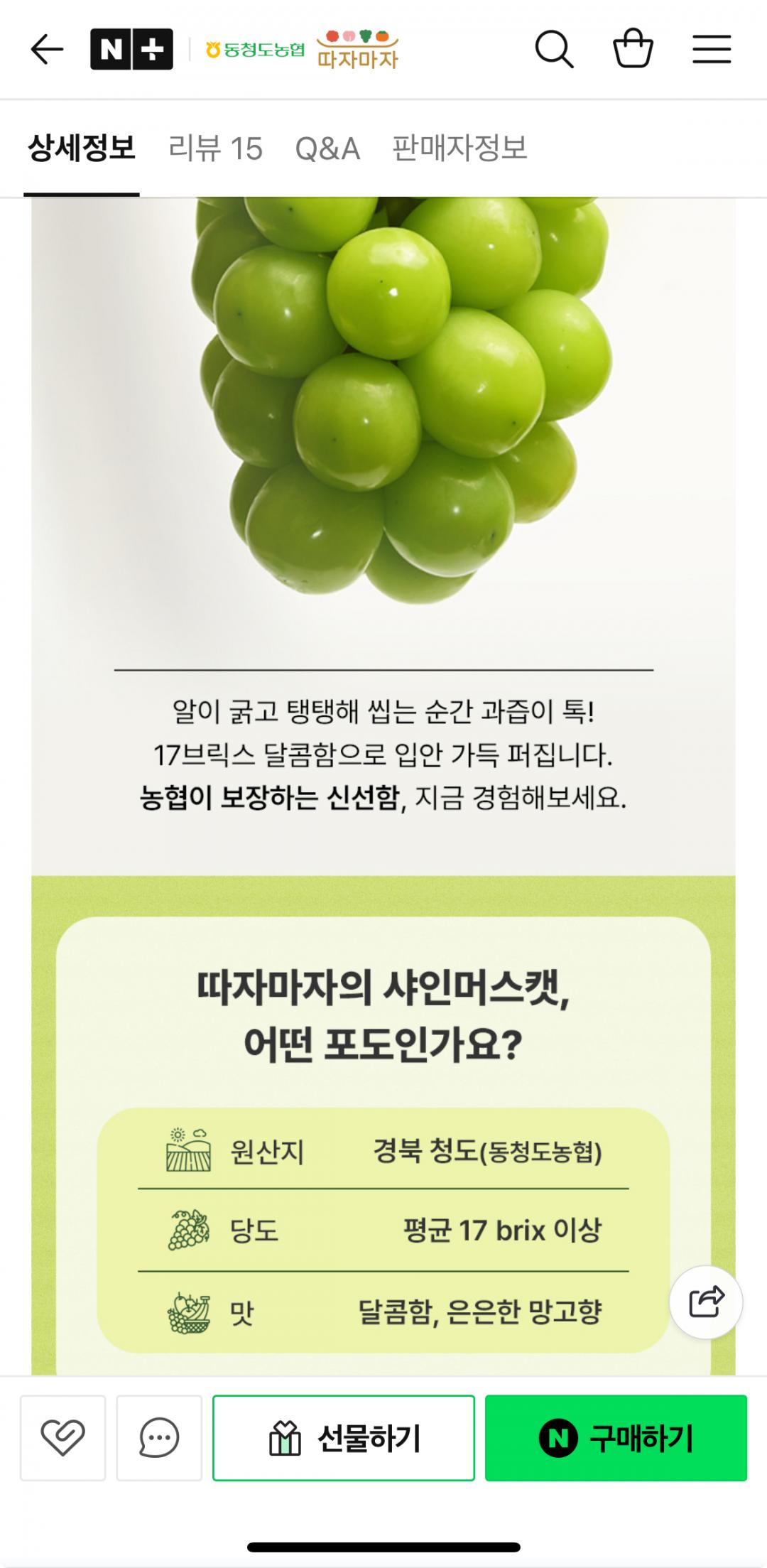 [네이버] 청도농협 고당도 샤인머스켓 2kg (21,900원/무배)