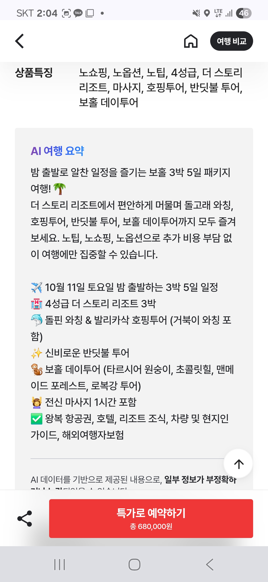 보홀 3박5일 패키지인데 팁/옵션/쇼핑 없는거라 좋네요~