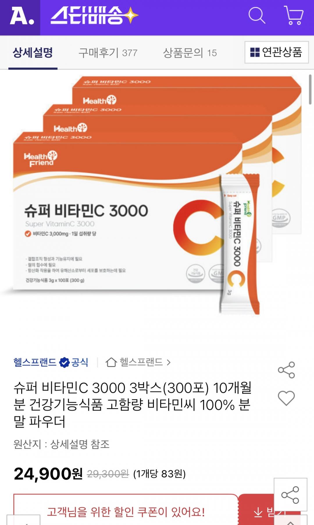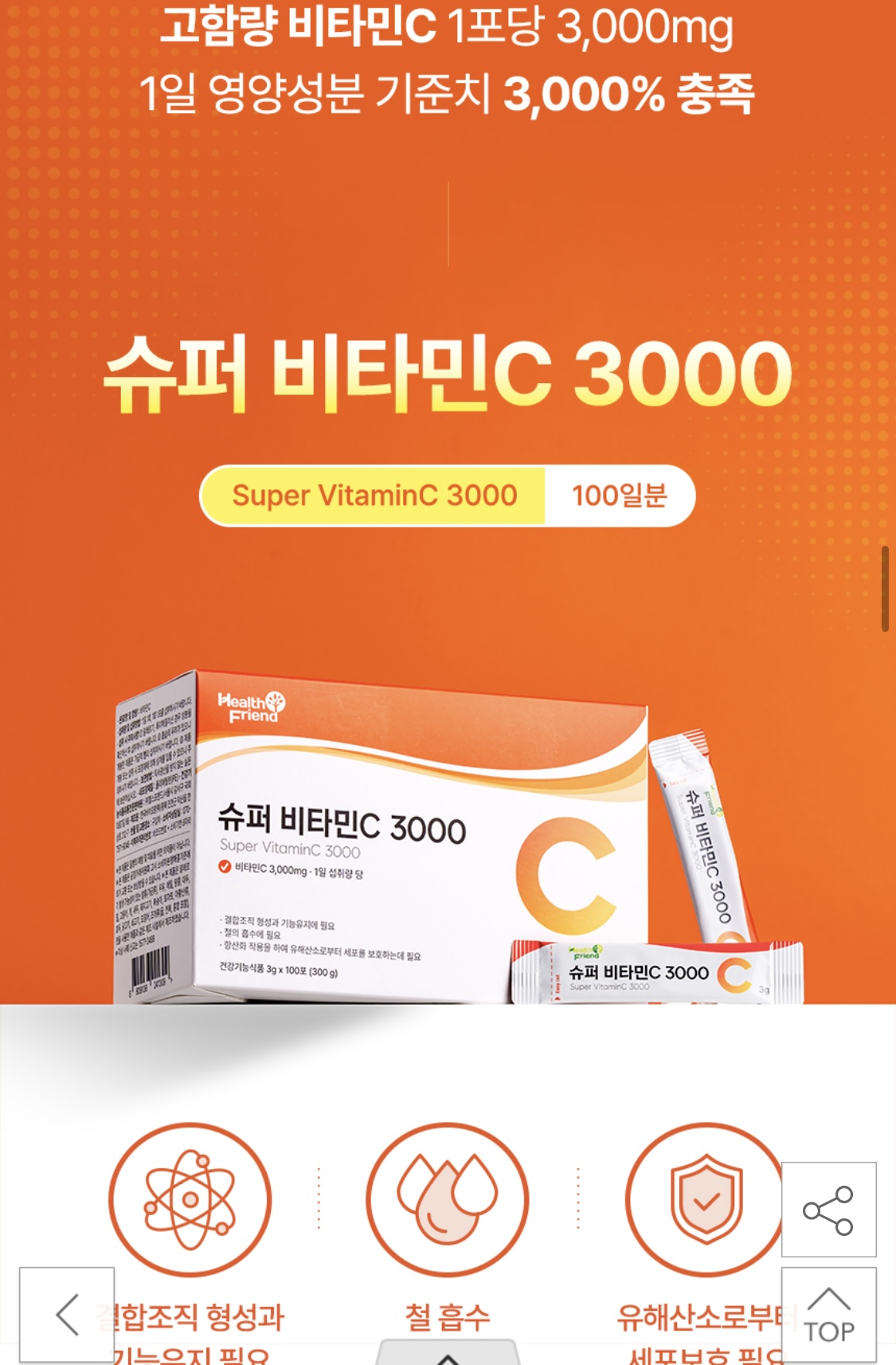 [옥션] 슈퍼 비타민C 3000 100포 x 3박스 10개월분 대용량 (24,900원/무료) > 국내핫딜