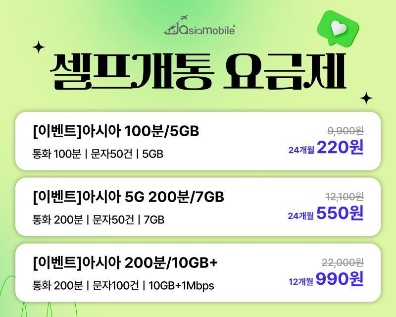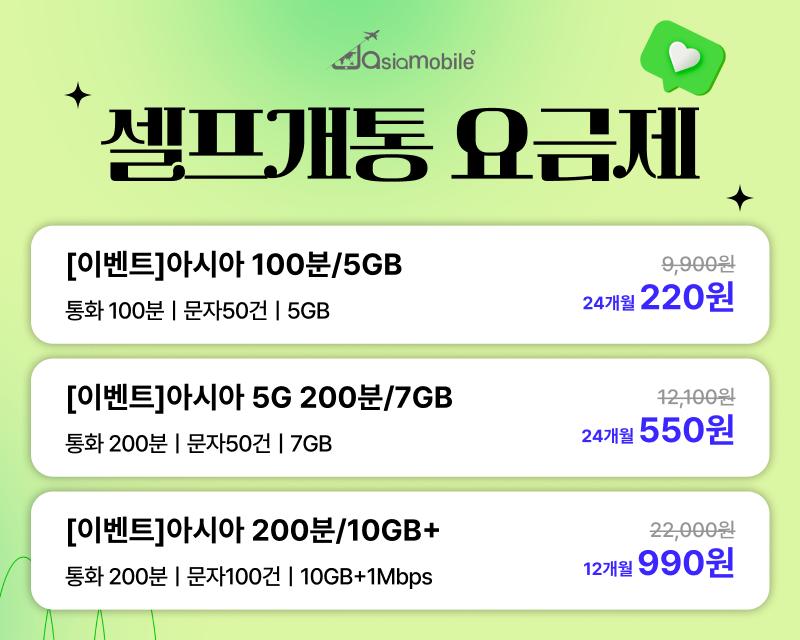 [아시아모바일] 데이터10GB+1Mbps (990원)