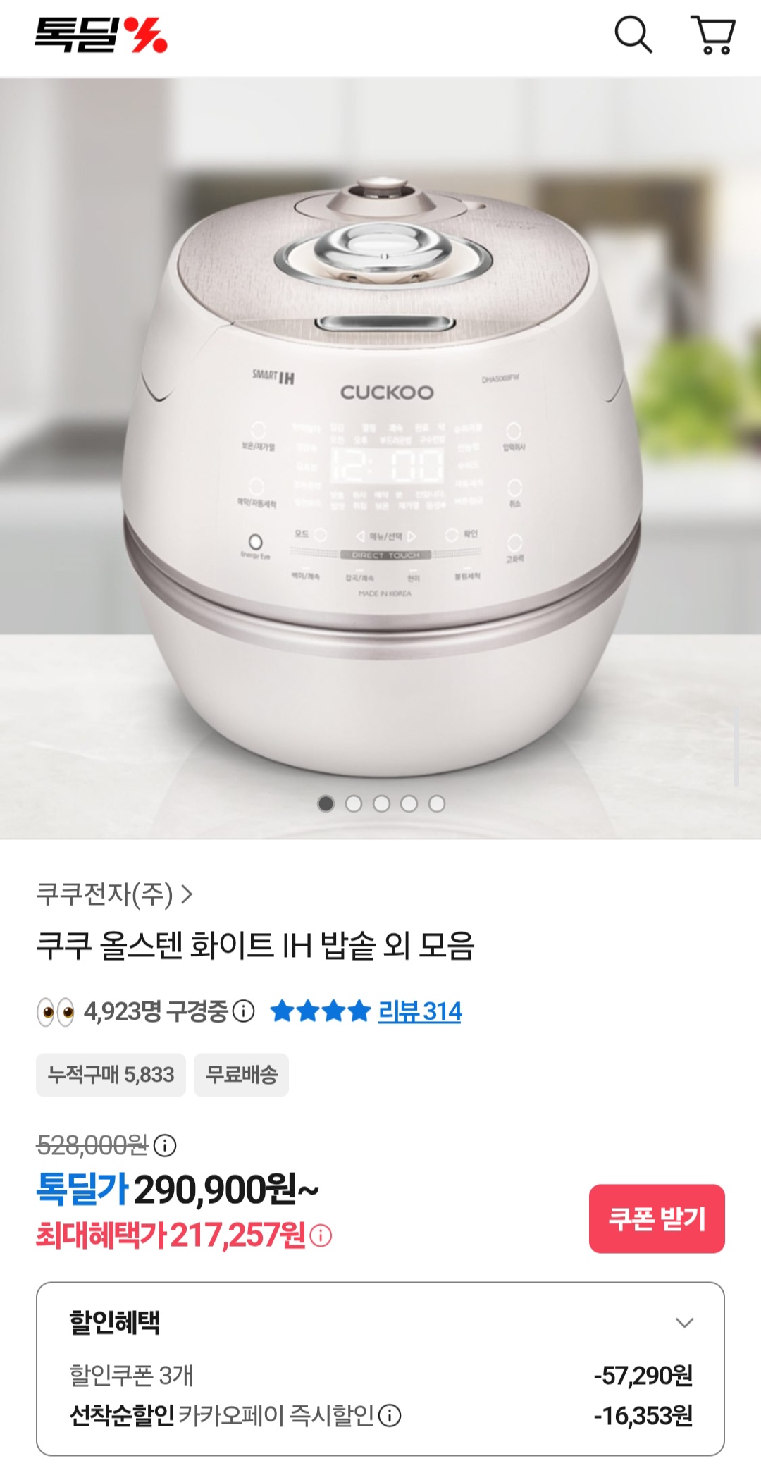 [카카오] 쿠쿠 올스텐 화이트 IH 밥솥 (217,253원/무료)