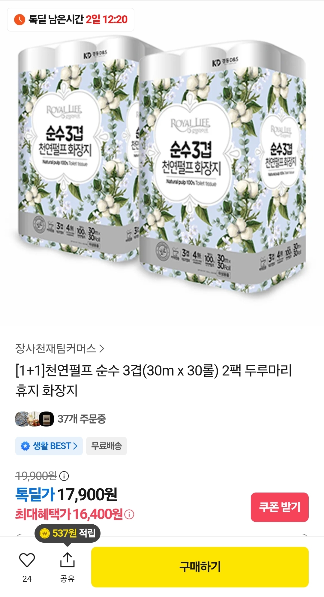 [톡딜] 1+1 천연펄프 순수 3겹 30롤×2팩 17,900원 (16,400원/무료)