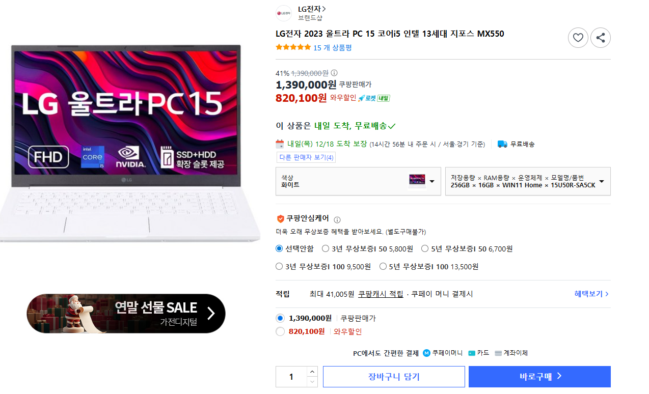 [쿠팡] 엘지 울트라PC 15U50R-SA5CK (820,100원/무료)