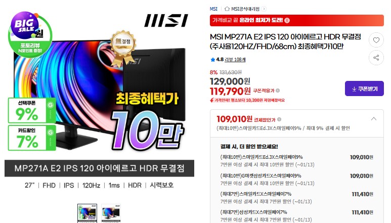 [G마켓] MSI MP271A E2 IPS 120 아이에르고 HDR 무결점 (체감가106,410원/무배) > 국내핫딜