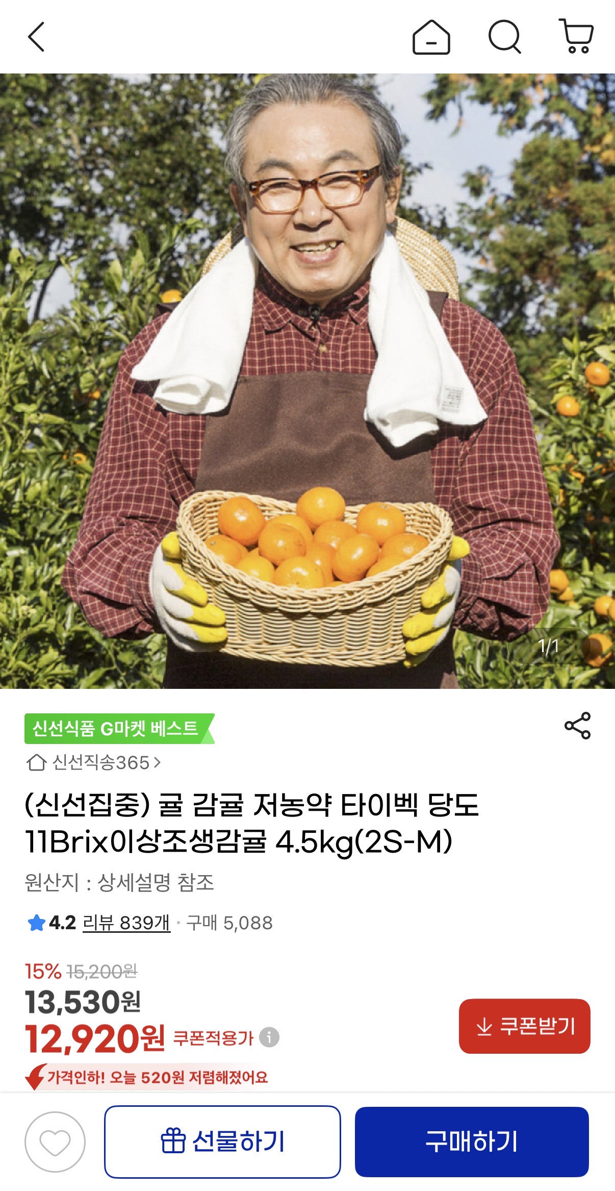 타이벡 조생감귤 15% 쿠폰 적용시 12,920원입니다 귤 좋아하시는분들 참고하세요
