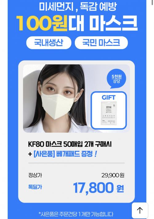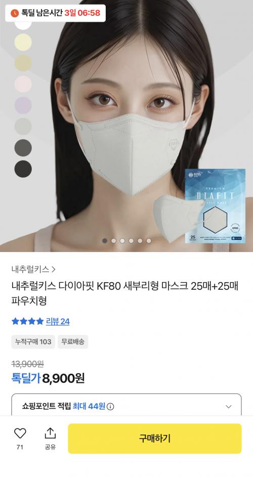 [카카오] 내추럴키스 다이아핏 KF80 새부리형 마스크 50매 (8,900원/무료)