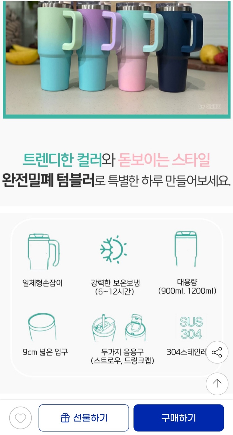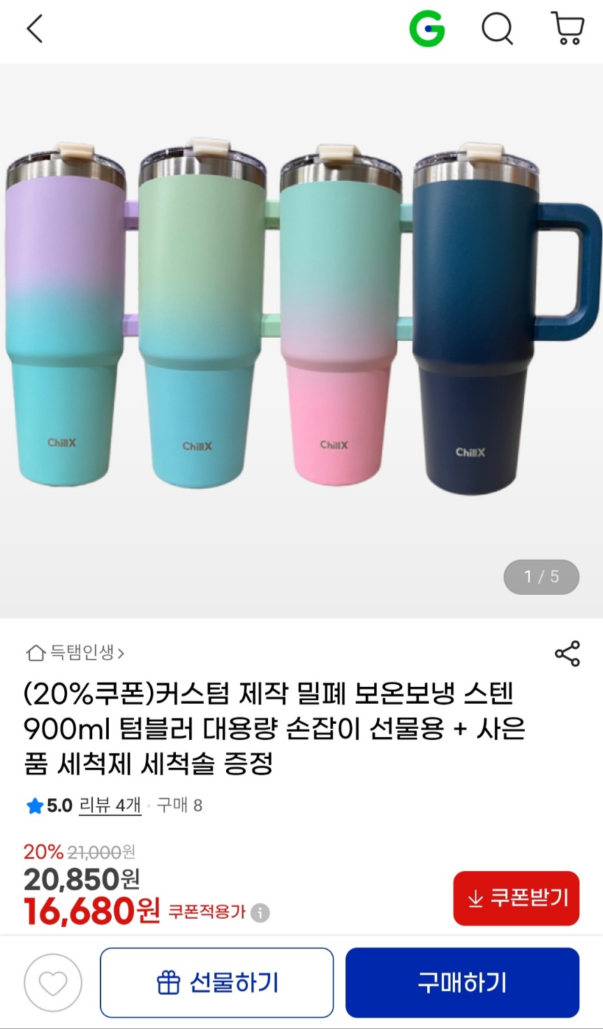 [지마켓] 커스텀 제작 스텐 900ml 대용량 텀블러 + 사은품 세척제, 세척솔 증정 (16,680원 / 무료배송) > 국내핫딜
