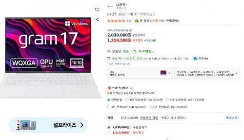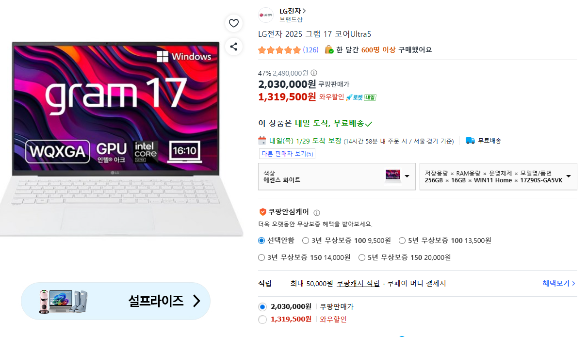 [쿠팡] 엘지 그램 17Z90S-GA5VK (1,319,500원/무료)