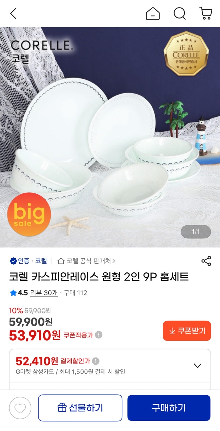 [지마켓] 코렐 카스피안레이스 원형 2인 9P 식기세트 (53,910원/무배)