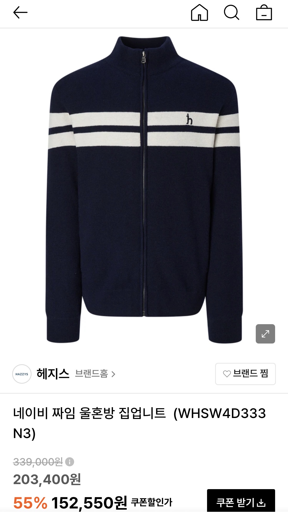 [애슬러] 헤지스 네이비 짜임 울혼방 집업니트 (WHSW4D333N3) (152,550원/무배) > 국내핫딜