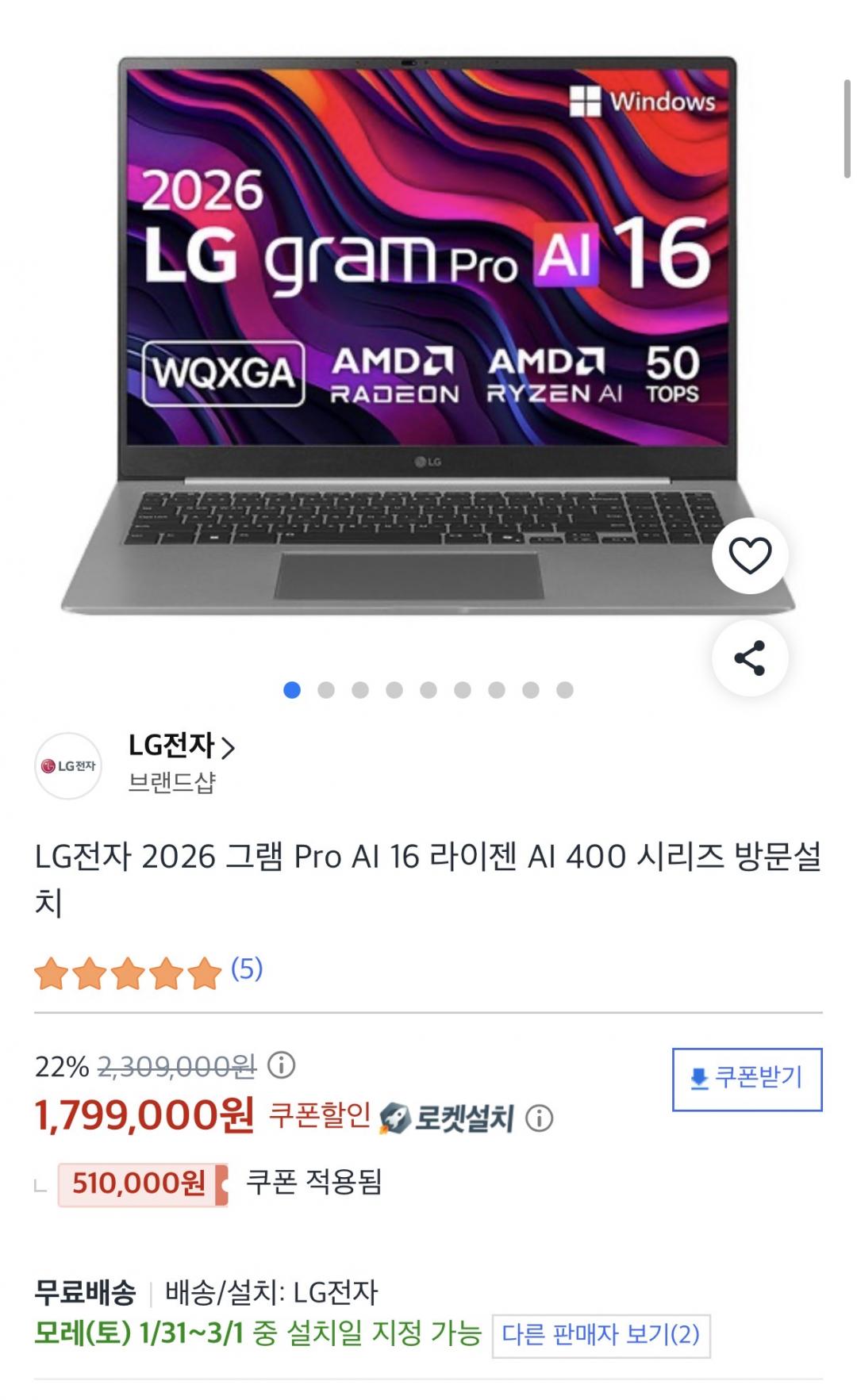 [쿠팡] LG전자 그램 Pro 16Z95U-GS5BK (1,799,000원/무료)
