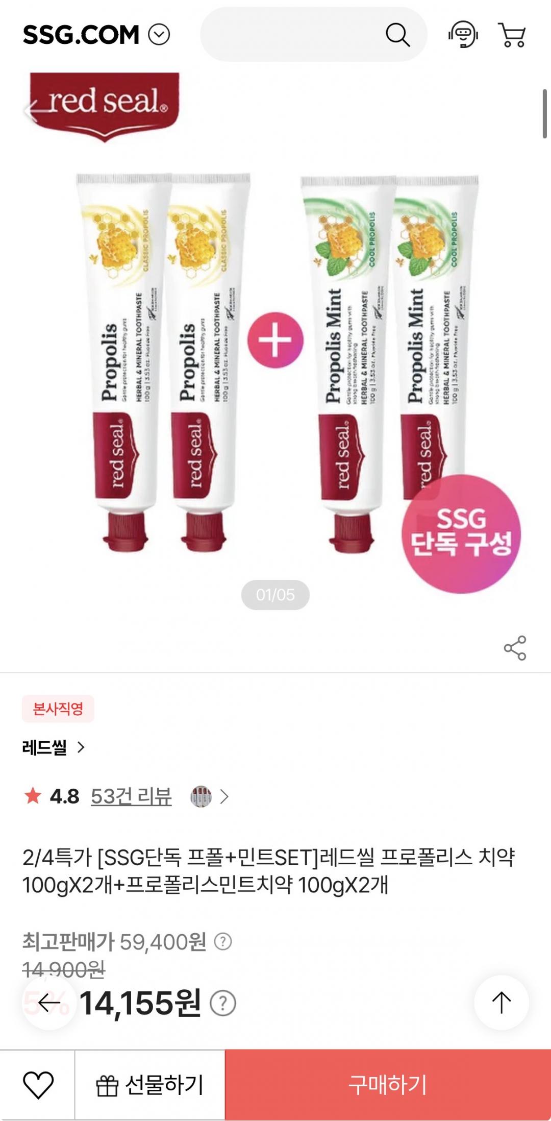 [ssg] 레드씰 프로폴리스 치약 100gX2개 + 프로폴리스민트치약 100gX2개 (14,155원/무료)