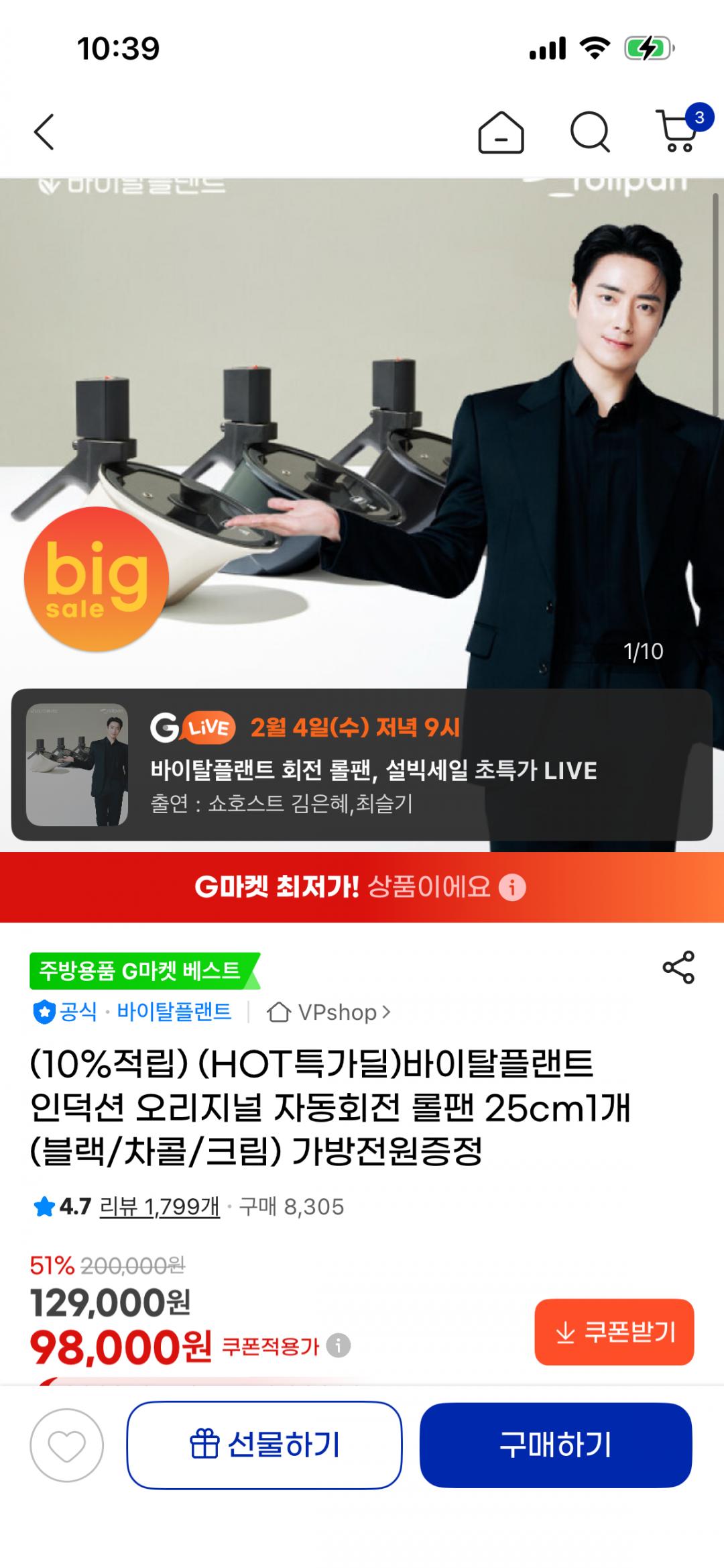 [지마켓] 바이탈플랜트 인덕션 오리지널 자동회전 롤팬 25cm1개 (98,000원/무료)