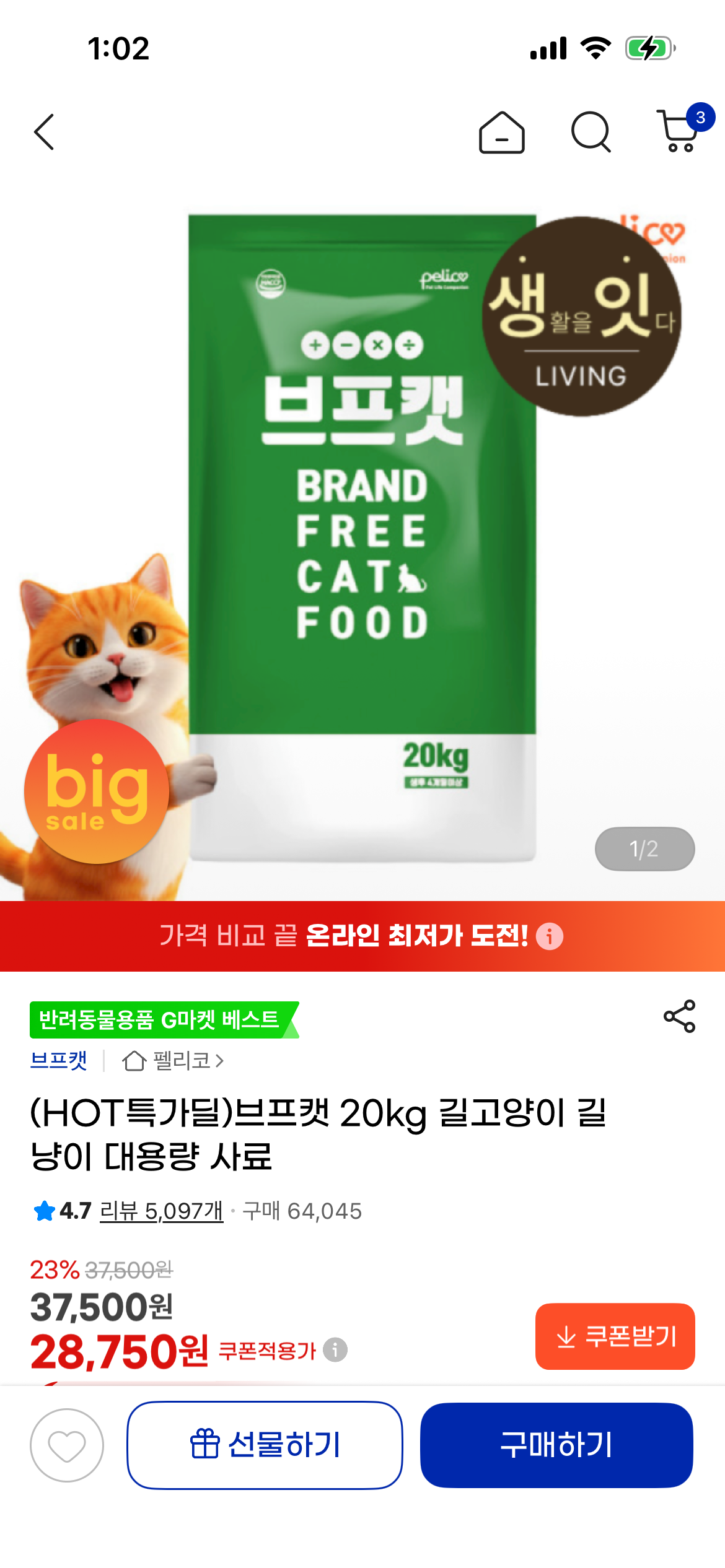 [지마켓] 브프캣 20kg 대용량 사료 (28,750원/무료) > 국내핫딜