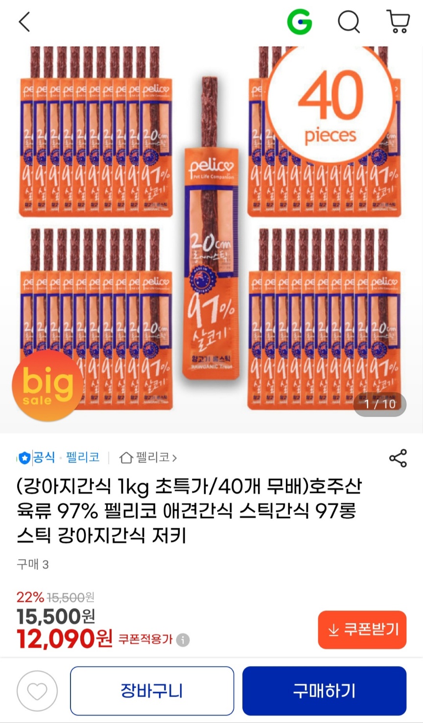 [지마켓] 호주산 육류 97% 펠리코 애견간식 스틱간식 총 40개 (12,090원 / 무료배송) > 국내핫딜