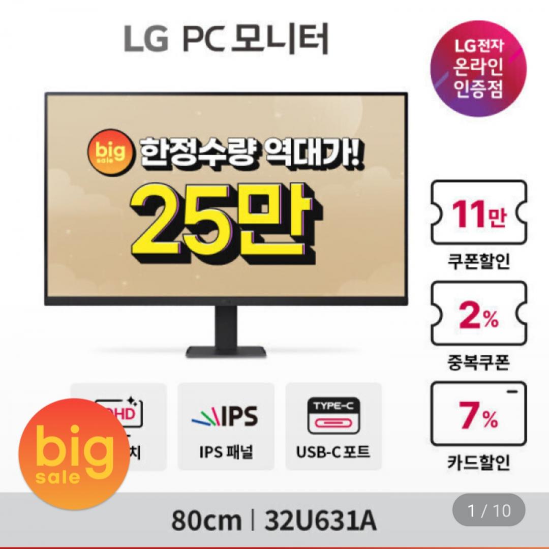 [지마켓] LG PC모니터 32U631A QHD IPS 100Hz USB-C 슬림베젤 슬림스탠드 (259,000원/무료) > 국내핫딜