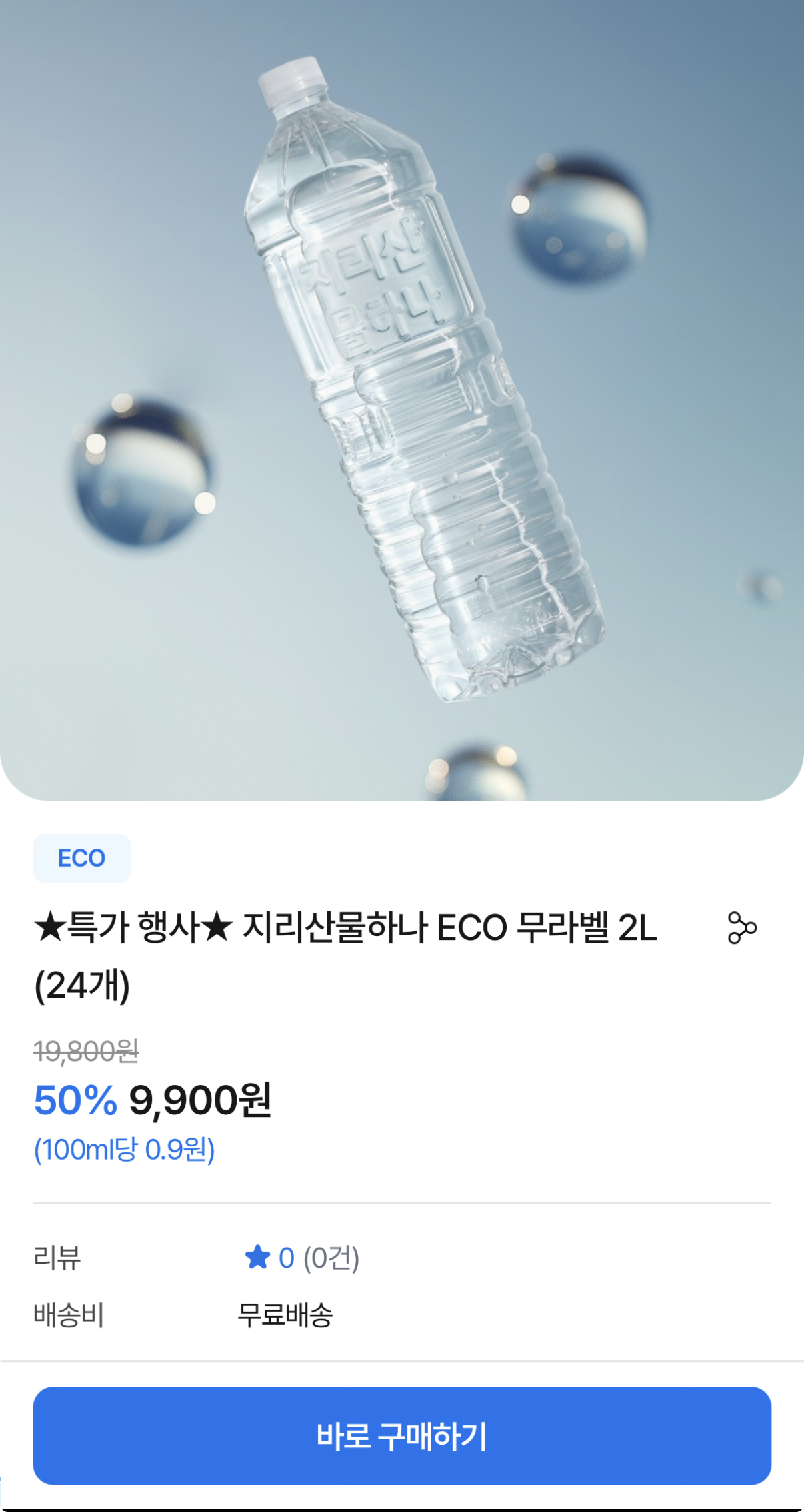 [지리산물하나공식] ECO 무라벨 500ml 80개 (12,900원/무료)
