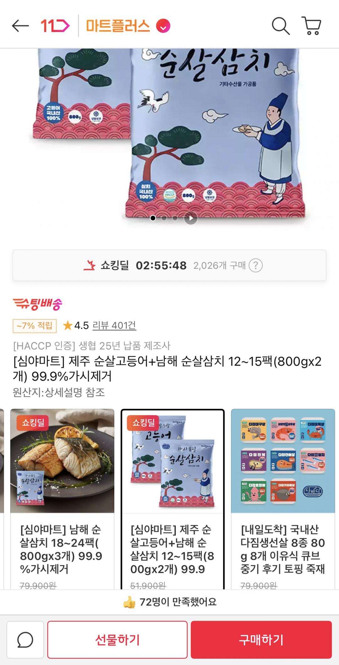 [11번가] 제주 순살고등어+남해 순살참치 800x2개 30,890원 / 무배 > 국내핫딜