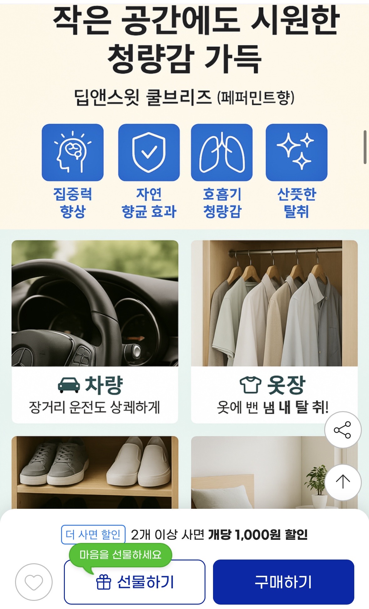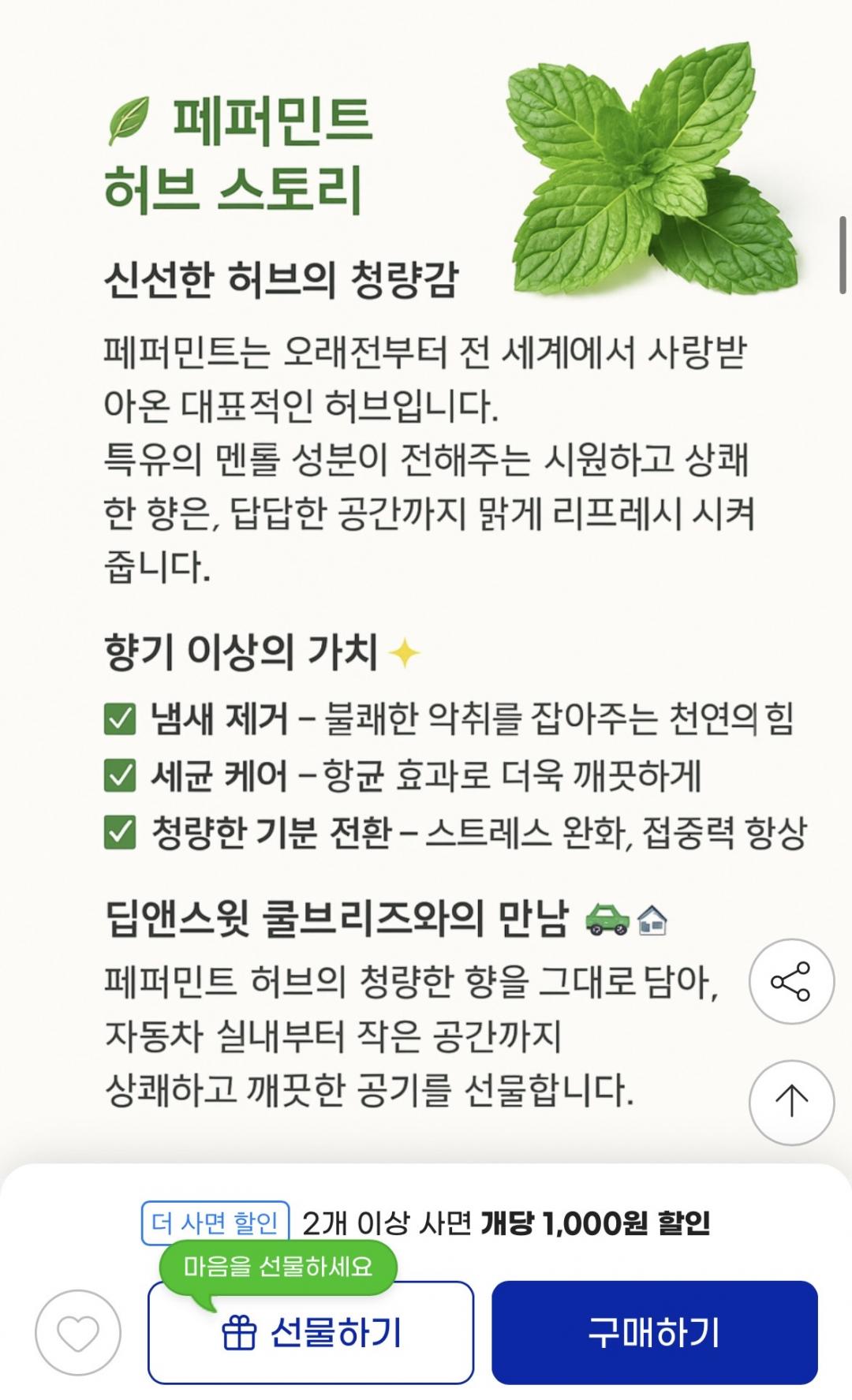 인위적인 방향제 느낌보다는 냄새를 잡아주는 느낌이라 더 깔끔합니다.