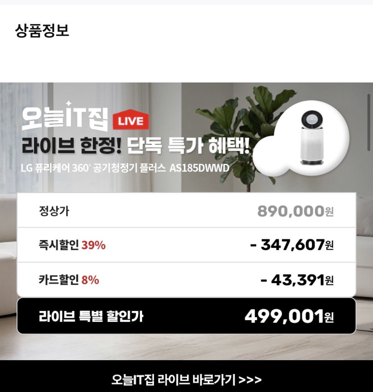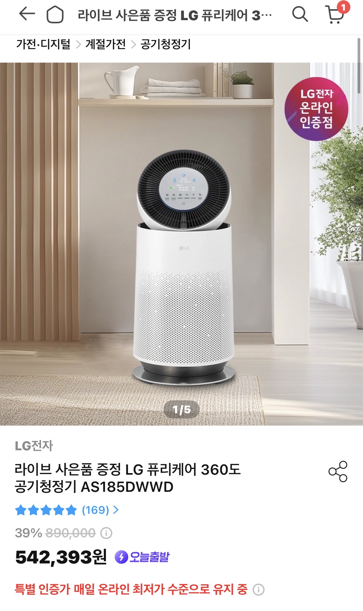 [오늘의집] LG 퓨리케어 360도 공기청정기 AS185DWWD(499,001원/무배) > 국내핫딜