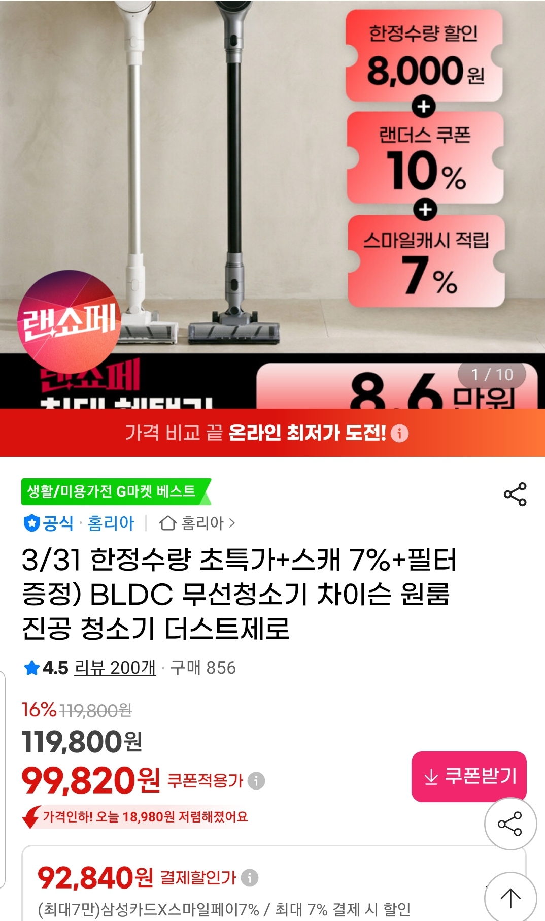 랜더스 페스타 쿠폰에 카드할인까지 다 받으면 9.2만 스마일캐시 적립 포함시 체감 8.6만 정도 나옵니다