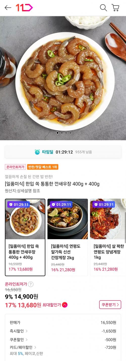 [11번가] 일품미식 한입 쏙 통통한 깐새우장 400g+400g (14,900원/무료) > 국내핫딜