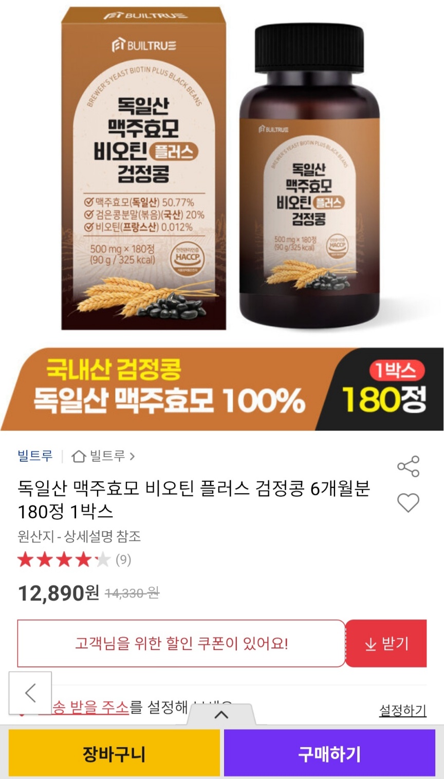 [옥션] 독일산 맥주효모 비오틴 플러스 검정콩 6개월분 180정 (12,890원 / 무료배송)