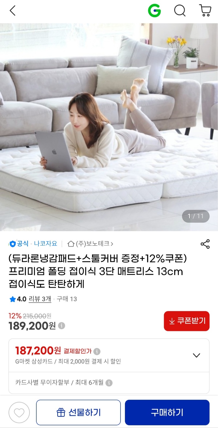[지마켓] 접이식 3단 매트리스 13cm (189,200원 / 무료배송) > 국내핫딜