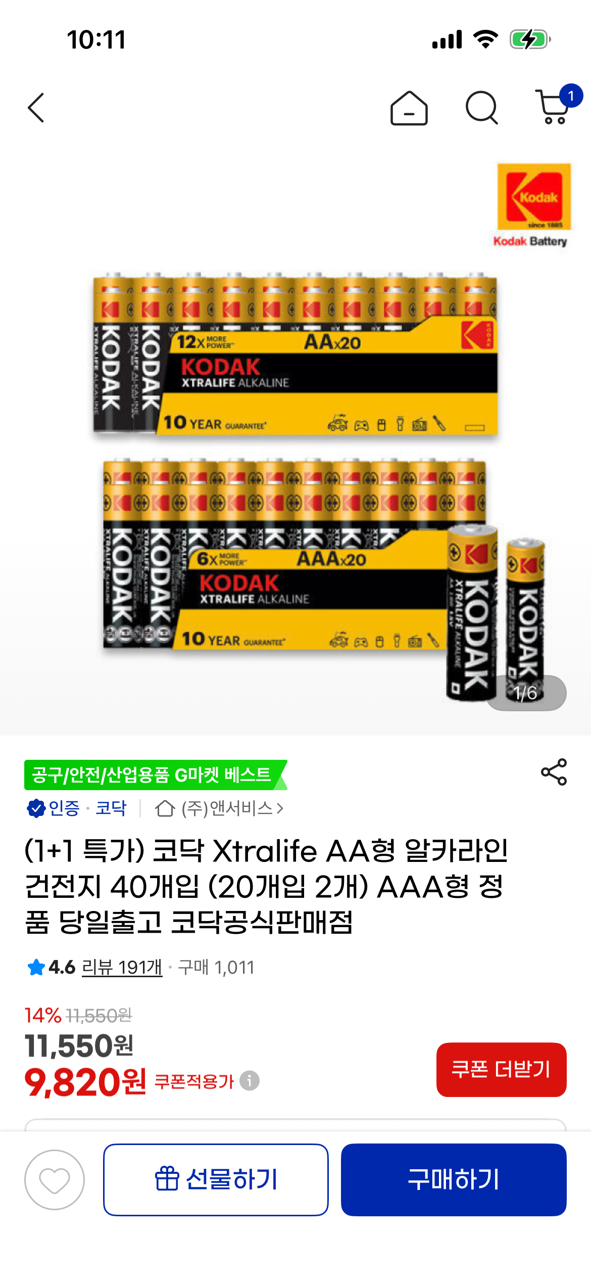 [지마켓] 코닥 AA형 알카라인 건전지 40개입 (20개입 2개) (9,820원/무료)