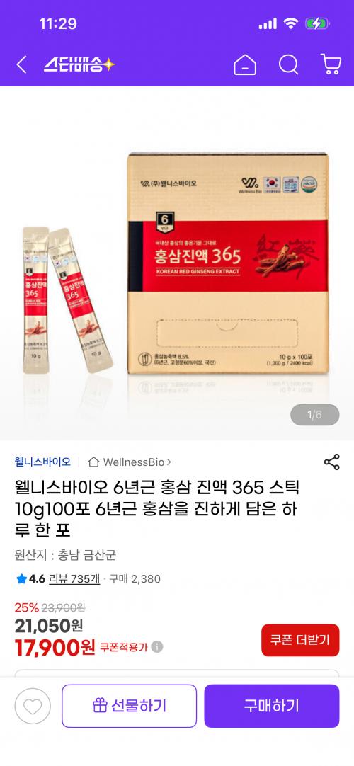 [지마켓] 웰니스바이오 6년근 홍삼 진액 365 스틱 10g100포 (17,900원/무료) > 국내핫딜
