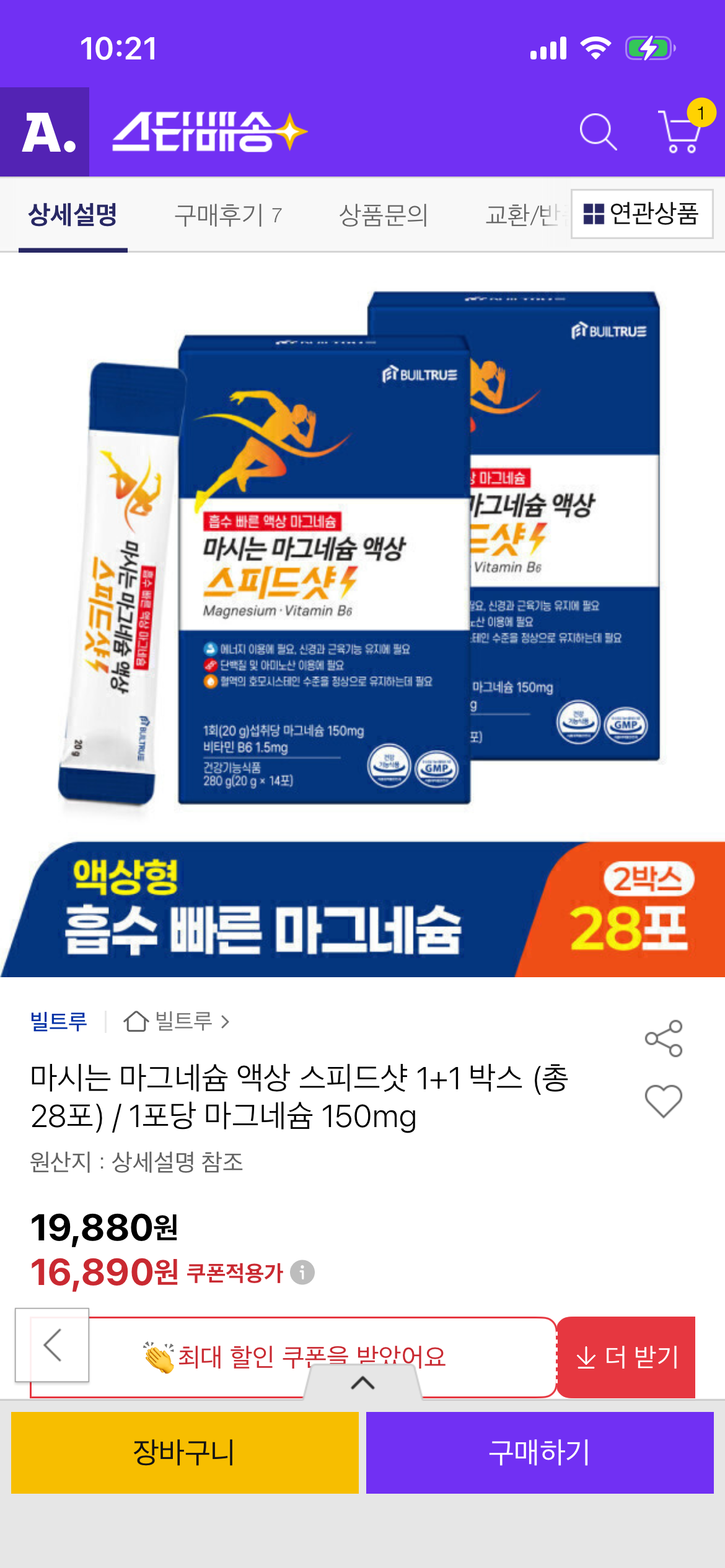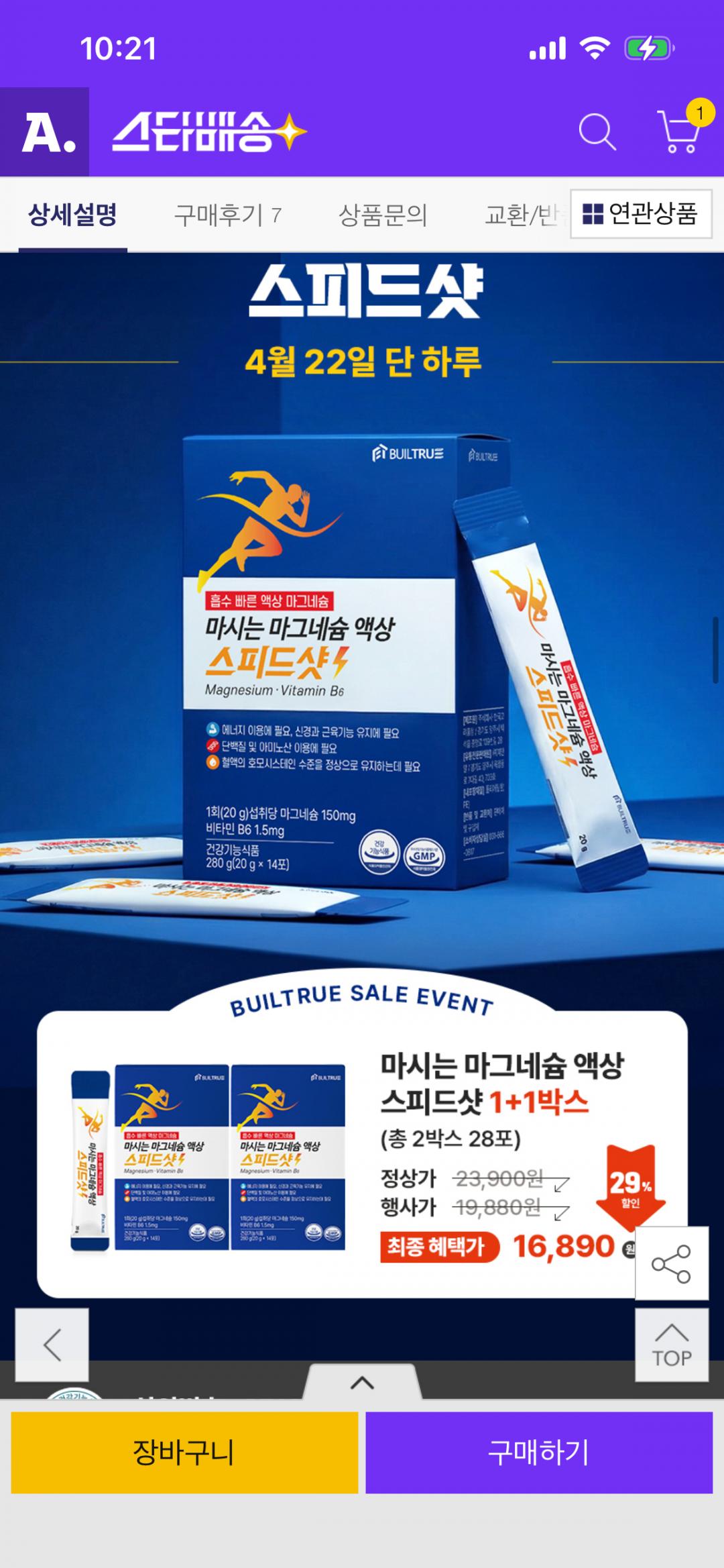 [옥션] 마시는 마그네슘 액상 스피드샷 1+1 총 28포 (16,890원/무료)