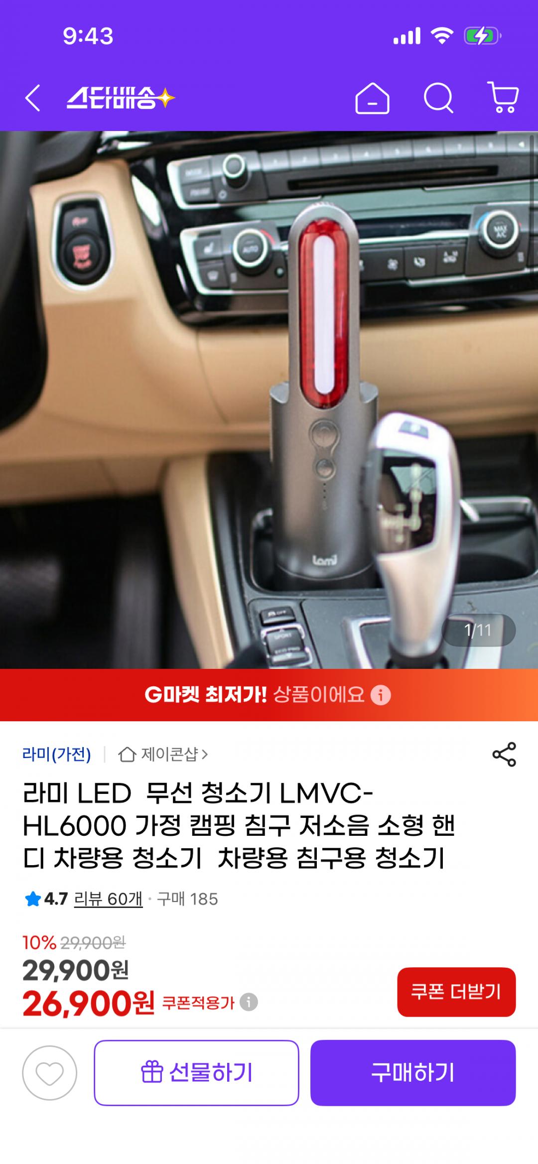[지마켓] 저소음 소형 핸디 차량용 청소기 (26,900원/무료)