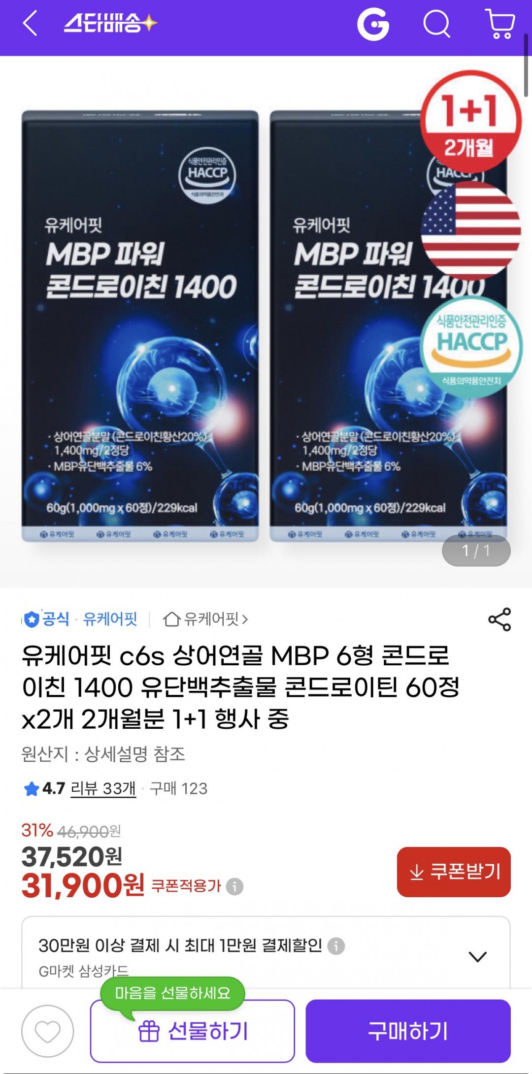 [지마켓] 유케어핏 c6s 상어연골 MBP 31,900원/무배