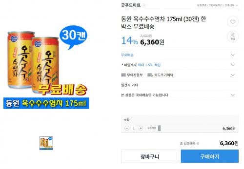 지마켓에서 동원 옥수수수염차 175ML X 30캔을 6360원에 무료배송으로 팔고있습니다. 30캔에 6360원이면 나름 저