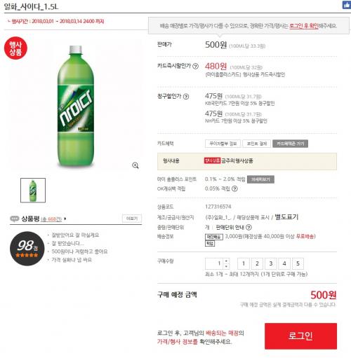 홈플러스에서 일화 페트 음료수 외 500원부터 유료배송으로 팔고있습니다. 현재 일화 콜라 사이다 아임보리 1.5L