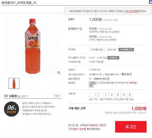 에 마지막으로 퓨어플러스 깔라만씨 모히또 2종 1.0L 1000원에 판매중입니다. 현재 홈플러스 행사중인 컵라면 라면