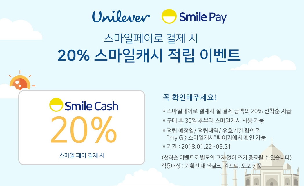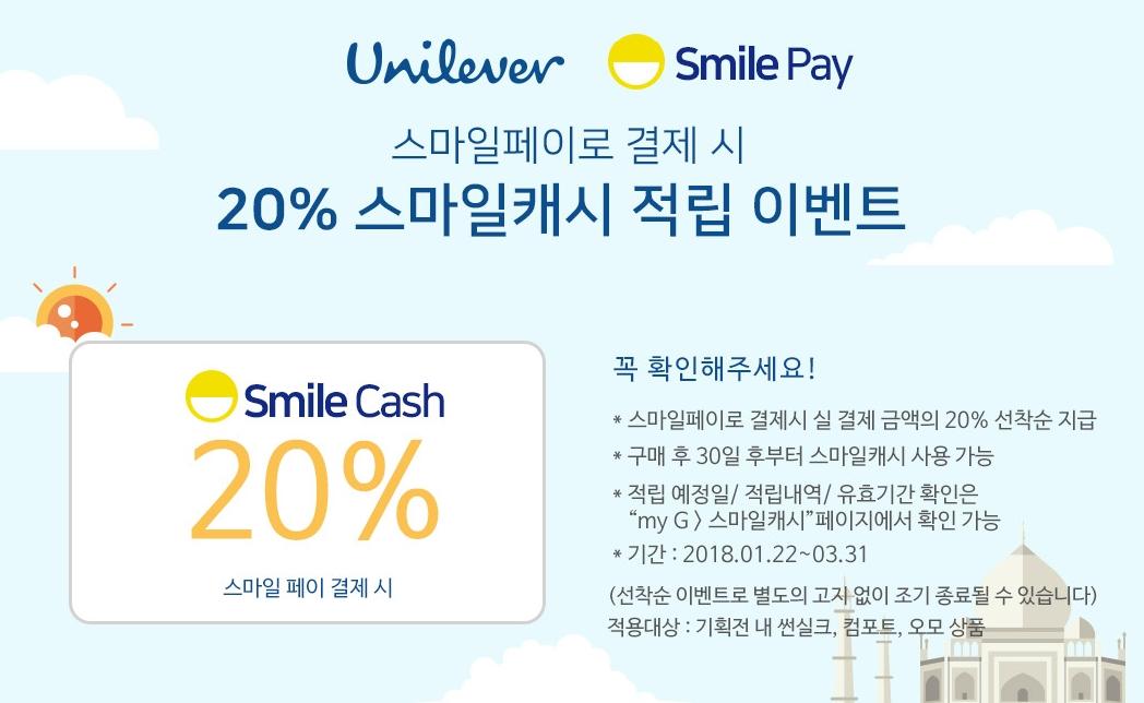 3. 추가로 일부 제품을( 썬실크, 컴포트, 오모 상품) 스마일페이 결제시 20% 스마일 캐시 적립 선착순 이벤트도 진행중입니다.
