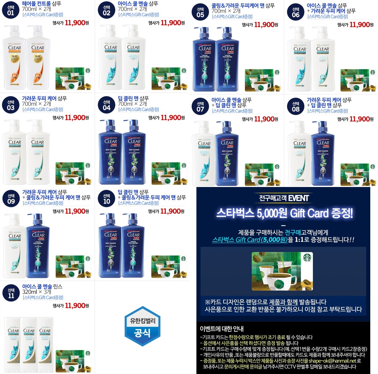[G마켓] 유니레버 클리어 샴푸 여러가지 700ml 2개 + 스타벅스카드 5천원권 증정 외 일부제품 추가적립 (10,900 / 무료)