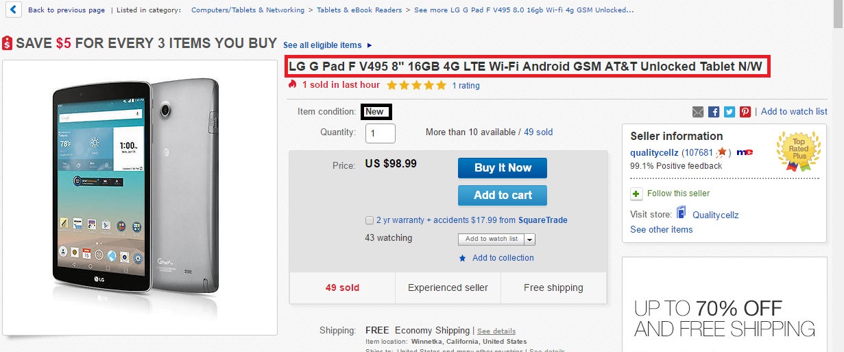 [EBAY] LG G Pad F V495 8" 16GB 4G LTE Wi-Fi Android GSM AT&T Unlocked Tablet N/W(98.99/fs) > 해외핫딜