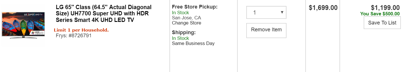 이 할인코드는 스토어픽업에만 적용이 되네요~ 배송시에는 $1,699 입니다. 구매 전 참고하세요~ |