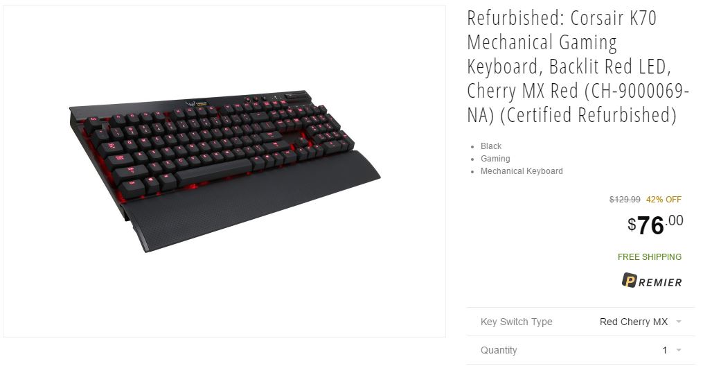 [neweggflash] Refurbished: Corsair K70 Mechanical Gaming Keyboard, Backlit Red LED, Cherry MX Red ($76/FS) > 해외핫딜