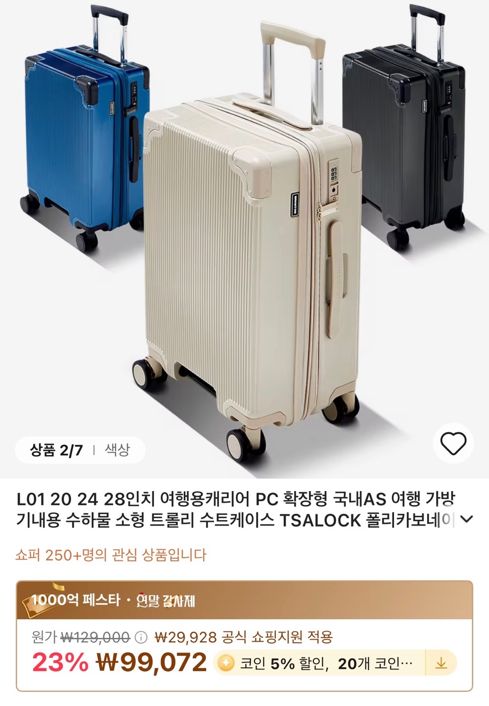20~28인치 선택 가능하고 확장형입니다. 폴리카보네이트 재질이고, 여행용으로 괜찮아 보입니다.