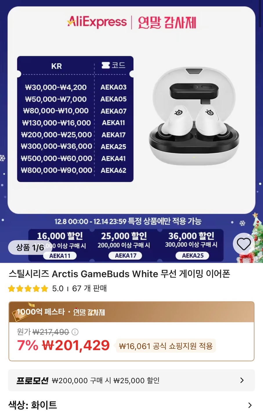 [알리] 스틸시리즈 GameBuds 화이트 무선 이어폰 (191,429원 / 무료)