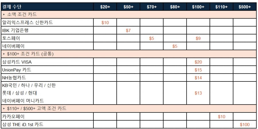 - 100달러 이상 구매 시, 13달러 즉시 할인: KB Mastercard, 삼성 Mastercard, 하나 Mastercard,우리 Mastercard, 신한 Mastercard, 롯데 Mastercard, Naverpay MoneyCard Visa Card, 현대 Visa Card